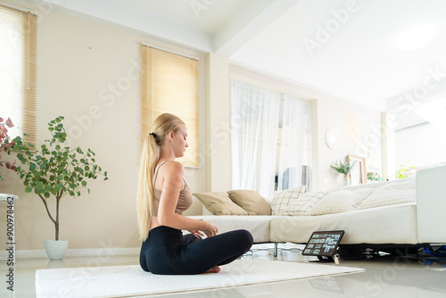 A young girl in tight workout clothes is practicing yoga poses by herself in her living room. She is doing basic warm up stretches. She is working her arms legs chest stomach hips and her whole body.