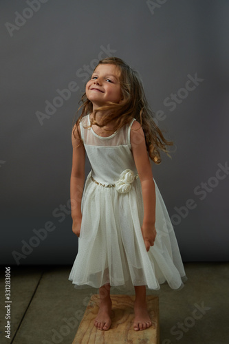 A young girl on gray background makes a funny face