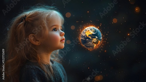 A young girl whispering words of hope and kindness to a floating Earth