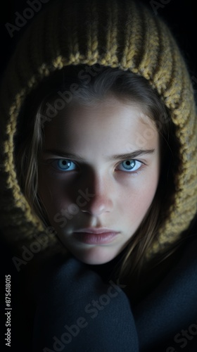 a young girl with blue eyes and a yellow hoodie
