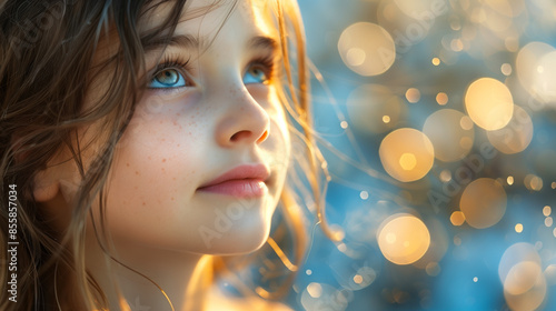 A young girl with freckles gazes upwards with a soft, dreamy expression. Her face is illuminated by warm, golden light with a background of bokeh lights
