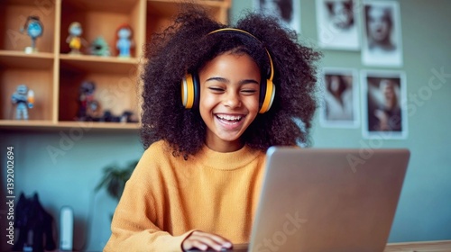A young girl with headphones laughs while using her laptop, enjoying online entertainment.