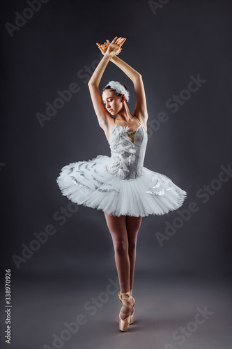 A young graceful ballerina dressed in professional attire, pointe shoes and a white tutu, demonstrates dance skills. Beautiful classic ballet dancer isolated on grey backgroung in photostudio