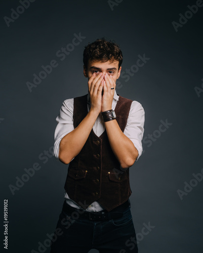 A young, handsome guy posing on a gray studio background. The man is stylish and elegantly dressed. He covers his face with his hands so as not to look at "it".