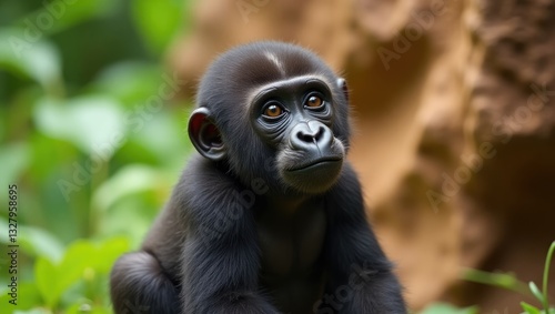 A young lowland gorilla curiously gazes forward with innocence. The vibrant green jungle backdrop accentuates its expressive eyes and contemplative demeanor.