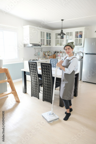 A young maid cleaning the house with a mop There is a kitchen backdrop