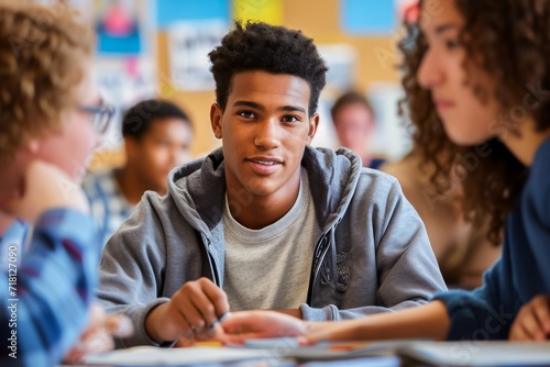 A young male student with a captivating smile studies in a diverse high school classroom setting, engaging with peers.