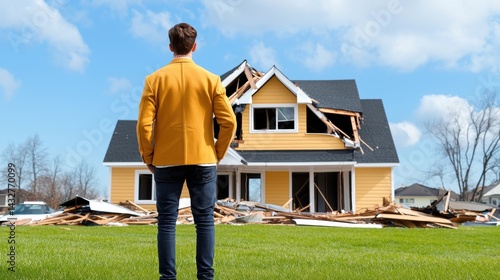 A young man in a yellow blazer stands looking at a severely damaged suburban house after a storm or accident.