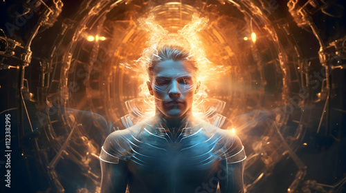 A young man with blond hair, bathed in ethereal light, appears to be connected to a futuristic technological structure. The image evokes a sense of otherworldliness and technological advancement.