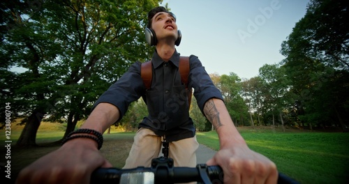 A young man with headphones and a backpack on his shoulders rides a bicycle in a city park. Front view. Summer day