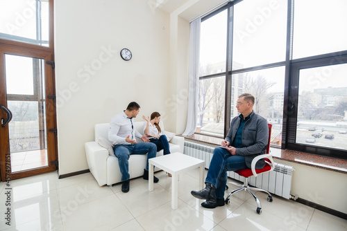 A young married couple of men and women talk to a psychologist at a therapy session. Psychology.