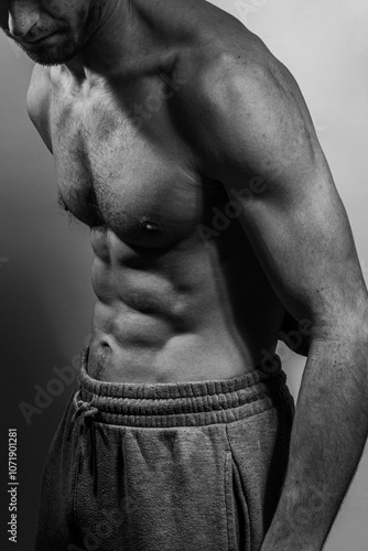 standing, health, lifestyle, sportsman, physique, trained, pecs, abdomen, abdominal, strength, caucasian, masculine, studio, healthy, abs, exercise, athletic, adult, athlete, model, fitness, fit, sport, person, torso, man, muscle, shirtless, guy, young, strong, male, chest, body, muscular, black, white