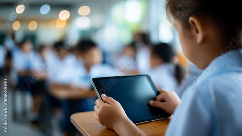 A young student focuses on a tablet amid lively classmates in a dynamic learning environment Generative AI