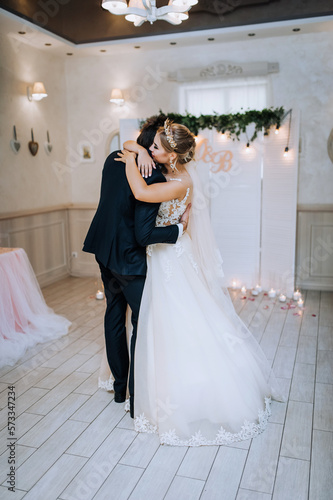 A young, stylish groom in a suit and a beautiful blonde bride with a diadem in a dress are hugging, dancing in a restaurant, indoors. Wedding portrait, photo of happy newlyweds.