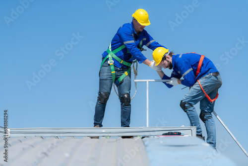 A young technician intern working on solar panels is fear of heights with senior engineers who are always helping out