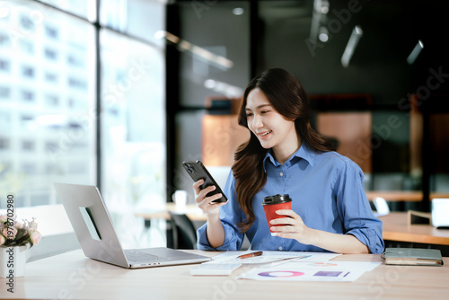 A young woman at a modern office desk using a smartphone while holding a coffee cup, with a laptop and financial charts, smiling in a bright workspace.