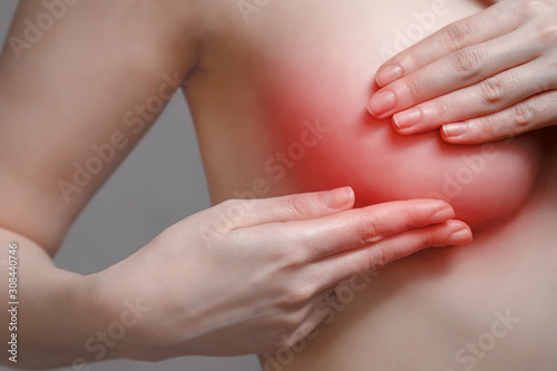 A young woman conducts self-examination of the chest because of pain. The concept of women's health. Red pain zone