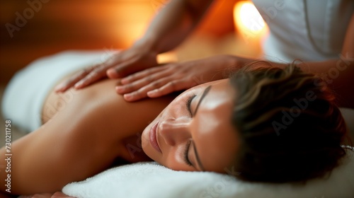A young woman enjoys a relaxing back massage at a spa, with a serene and peaceful expression on her face.