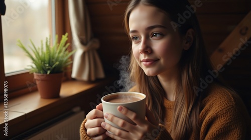 A young woman enjoys a warm beverage near a window, basking in the soft winter light. She gazes thoughtfully outside, lost in peaceful contemplation.