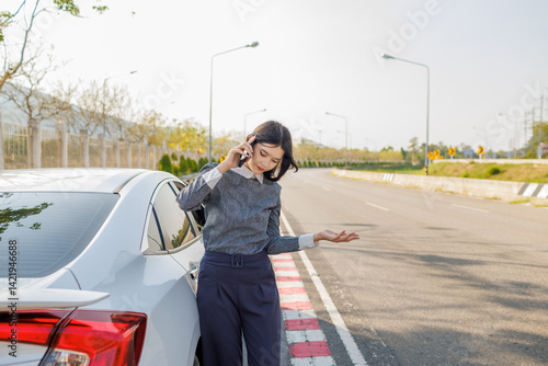 A young woman feels anxious as her car breaks down and stops by the roadside. She tries to call a relative for help