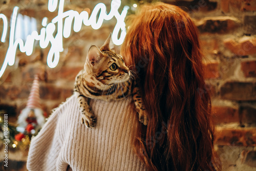 A young woman holds her beloved Bengal cat in her arms. Bengal cat breeder.