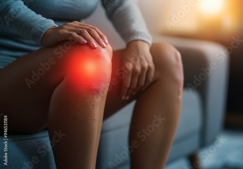 A young woman holds onto her sore knee while sitting on the couch. The red areas indicate injury.