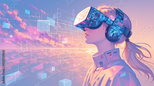 A young woman immersed in a vibrant virtual reality world, wearing a VR headset, navigates through digital landscapes filled with floating pixels.