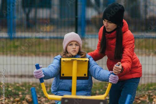 A young woman, mother, trainer, and a beautiful, strong teenage daughter are engaged in sports and fitness on exercise machines, training outdoors on a sports ground.