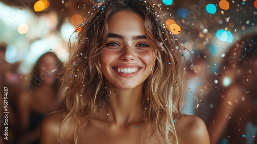 A young woman smiles brightly while celebrating with friends at a festive outdoor party surrounded by colorful lights and confetti