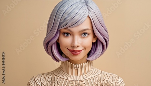 A young woman sporting a trendy bob with lavender-colored hair, twinkling silver eyes,