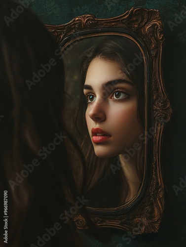 A young woman stares in confusion at a mirror that reveals a deceptive reflection of her true self.