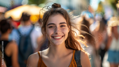 A young woman while walking in a crowd of people, smiling. Happy woman walking down the street on a sunny day. Walking concept. Lifestyle.