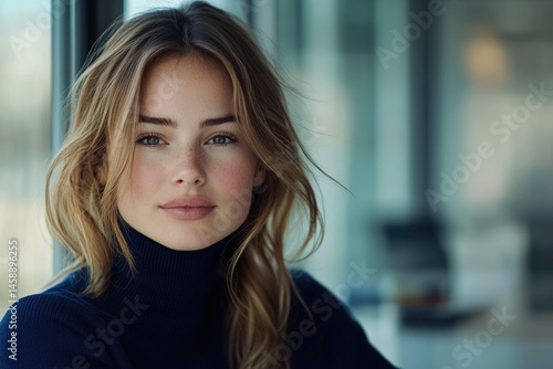 A young woman with light brown hair and freckles looks directly at the camera wearing a dark turtleneck.