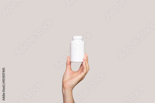 A young woman's hand holds a white plastic bottle isolated on a beige background. Mockup for branding a box with pills, capsules, pills, supplements or vitamins. Healthcare concept