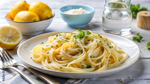 A zesty plate of linguine tossed with a light lemon garlic sauce, garnished with lemon zest