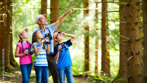 Aadults and children exploring forest with binoculars, nature education, outdoor learning, bird watching, naturalist, eco trail walking