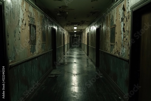 Abandoned building hallway, decaying walls, dark atmosphere, mystery, horror film setting