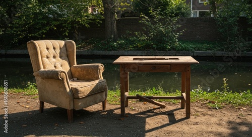 Abandoned Comfort: Worn Armchair and Rustic Table by Canal's Edge in Sunlight