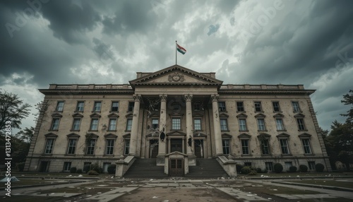 Abandoned Historic Building with Dramatic Clouds and Flag
