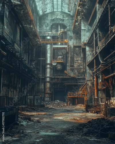 Abandoned industrial space with piles of waste, decaying machinery, rusted metal, desolate atmosphere, highresolution, gritty textures, dystopian feel