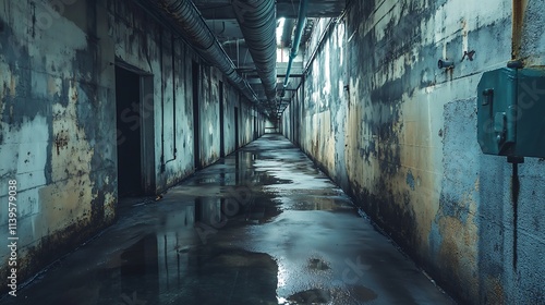 Abandoned Industrial Underground Tunnel. Concept of decay, neglect, and forgotten history.