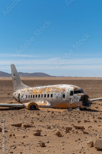 Abandoned Rusty Airplane Wreck in Desert Landscape Under Clear Blue Sky