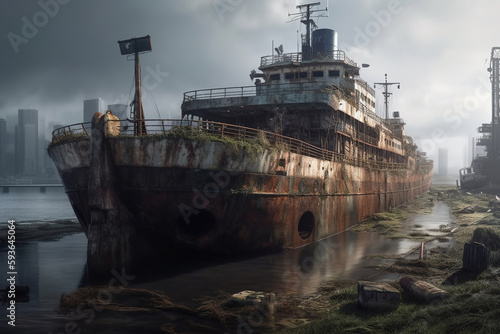 Abandoned ship after post-apocalyptic. Generative ai