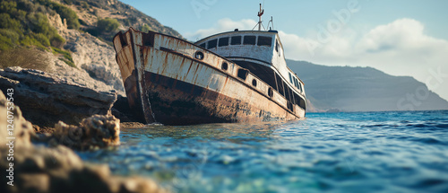 Abandoned ship rests on the rocky shore, surrounded by calm blue waters and distant mountains under a clear sky