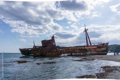 Abandoned stranded dimitrios shipwreck at the beach of Valtaki, Peloponnese, Greece