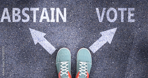 Abstain and vote as different choices in life - pictured as words Abstain, vote on a road to symbolize making decision and picking either Abstain or vote as an option, 3d illustration