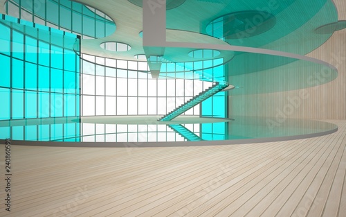 Abstract concrete and wood interior multilevel public space with window. 3D illustration and rendering.