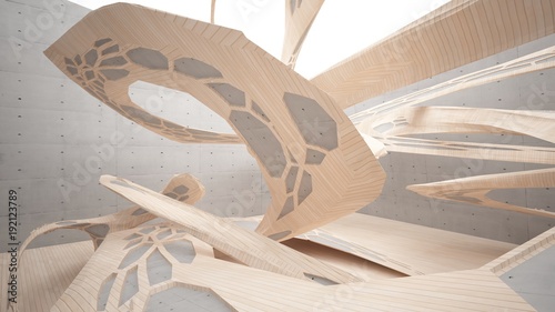 Abstract concrete and wood parametric interior with window. 3D illustration and rendering.