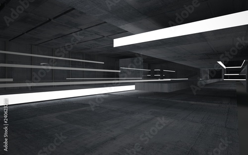 Abstract concrete interior multilevel public space with neon lighting. 3D illustration and rendering.
