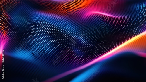 Abstract glowing, colorful, blue, red, orange, pink, and purple neon dots and lines.